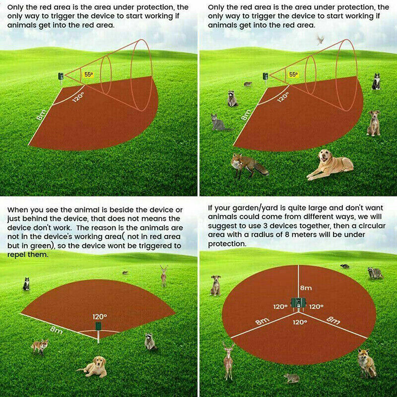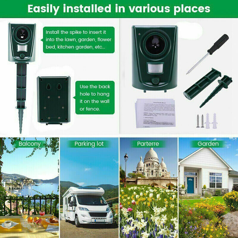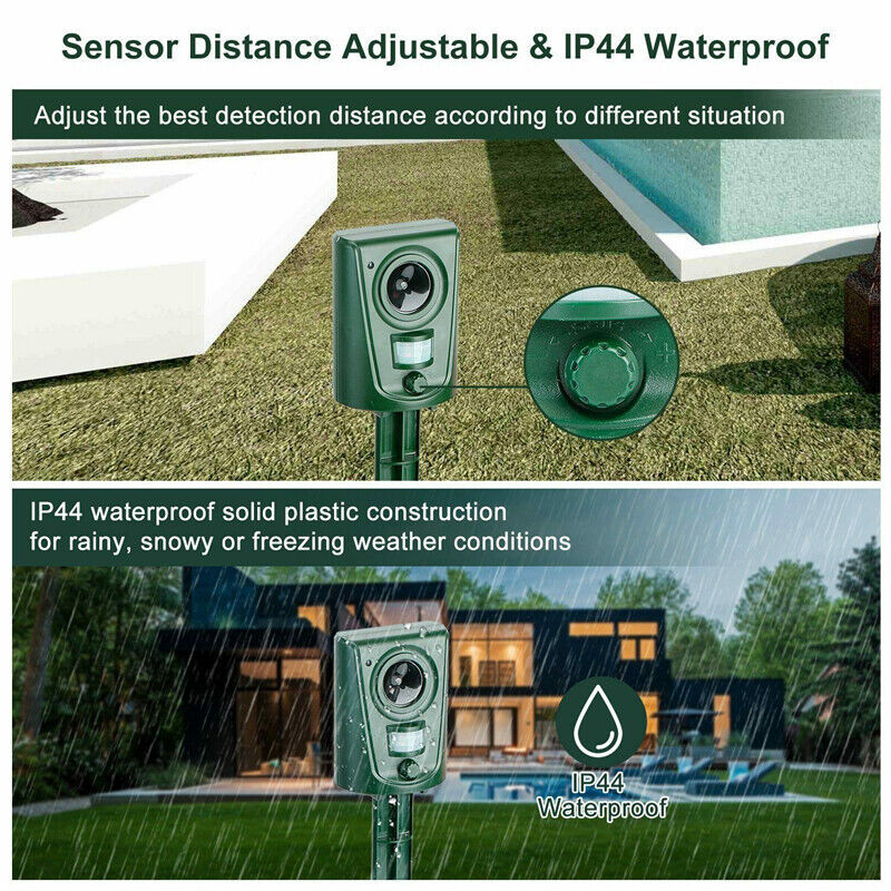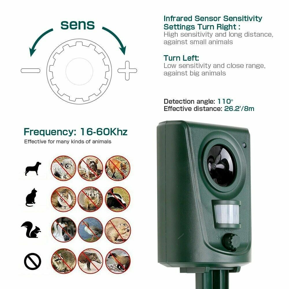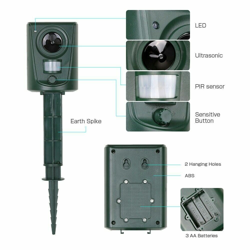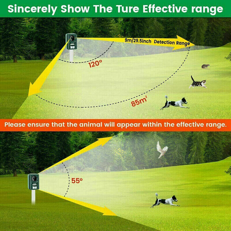 Sensitive PIR sensor and LED light, it will automatically detect the animal motions and transmit ultrasonic sound with LED light on.